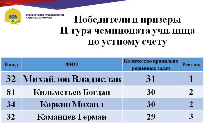 Завершился второй тур чемпионата училища по устному счету, в ходе которого участники в очередной раз продемонстрировали высокие навыки быстрой и точной работы с числами.