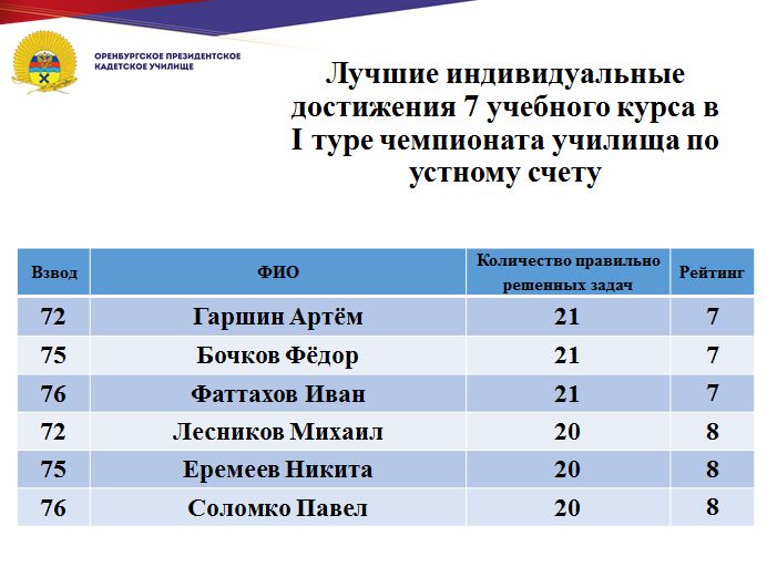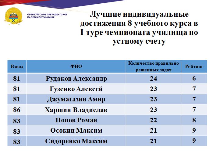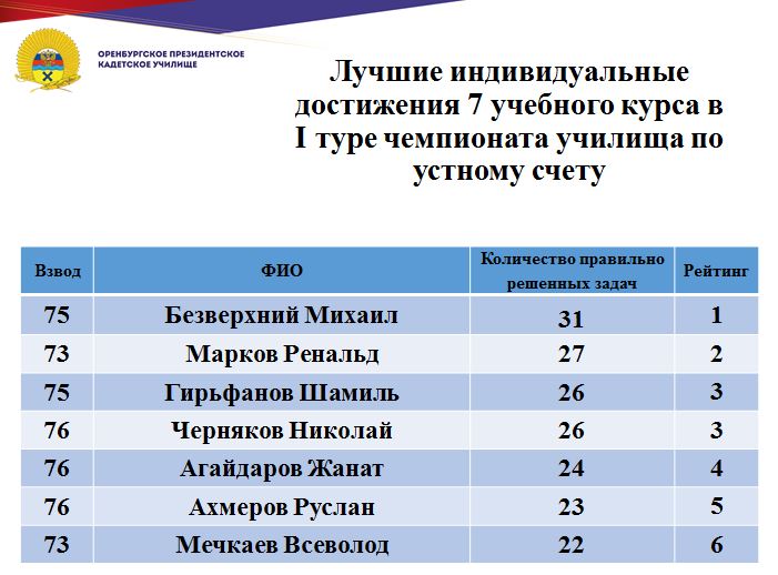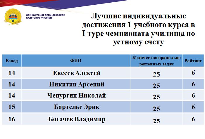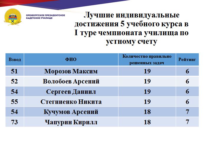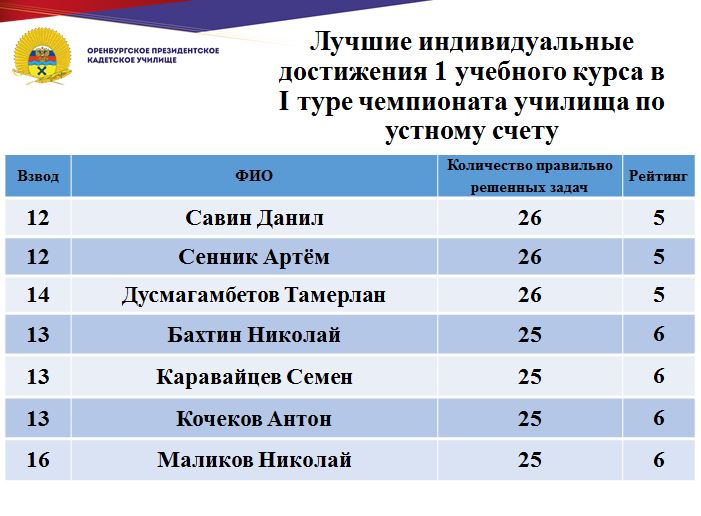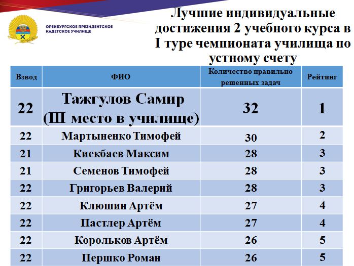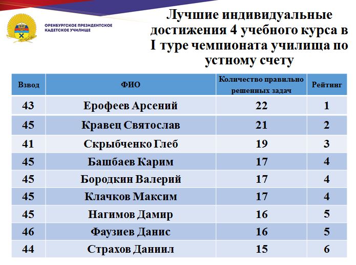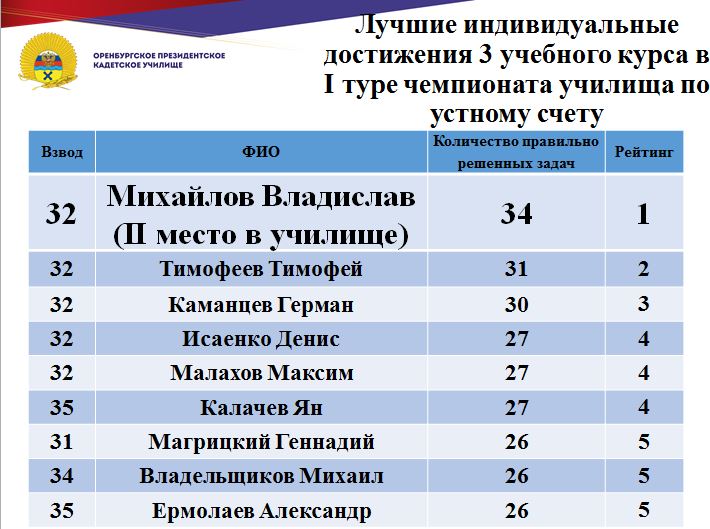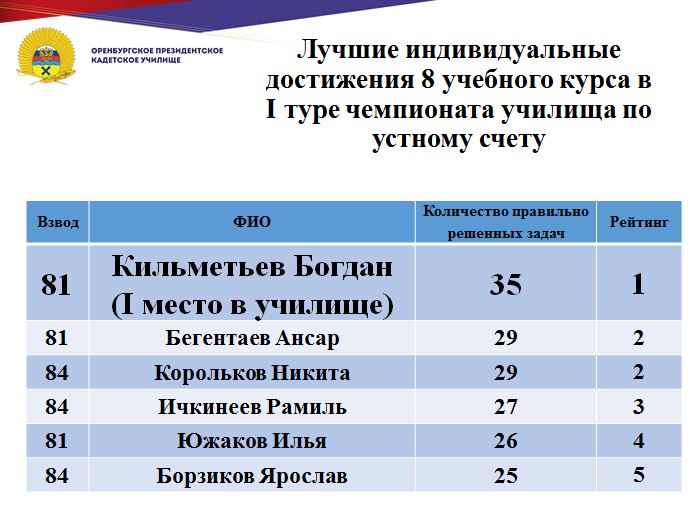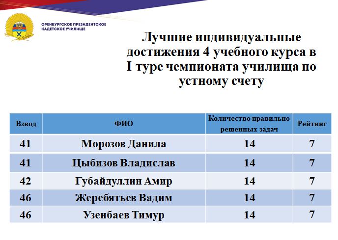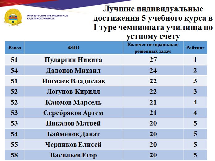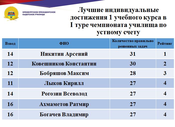 В минувшие дни состоялся 1 тур юбилейного, десятого чемпионата училища по устному счету среди кадет Оренбургского президентского кадетского училища. Традиционно состязания проходят ежегодно и собирают лучших счетчиков всех учебных курсов.