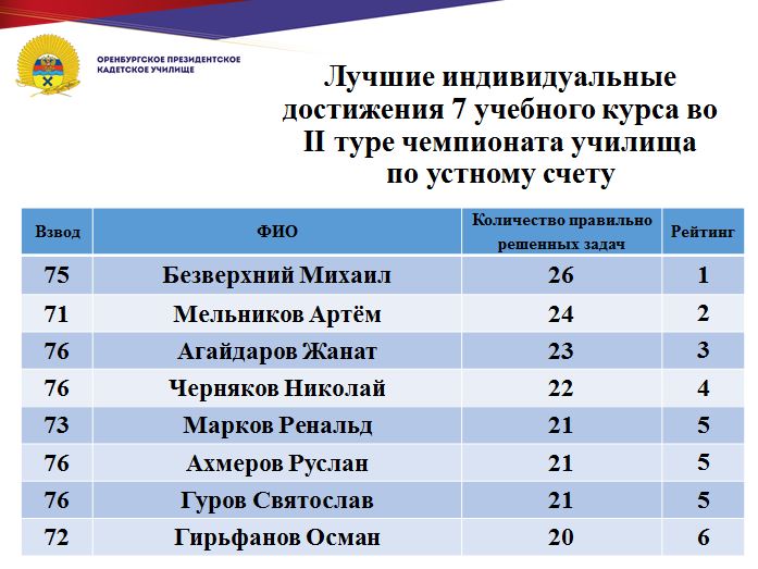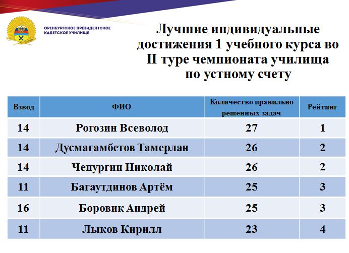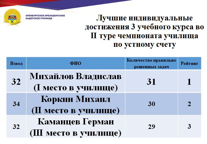 1 место — Михайлов Владислав (32 взвод) 31 задание из 36.