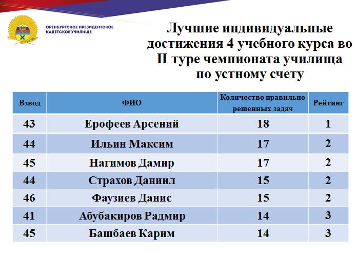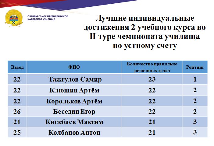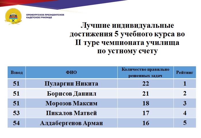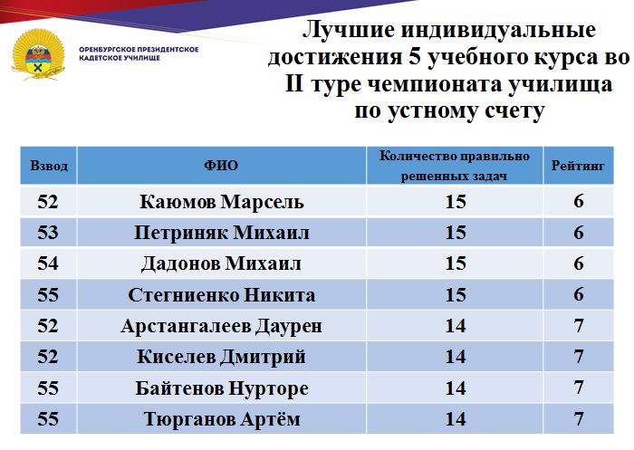 Завершился второй тур чемпионата училища по устному счету, в ходе которого участники в очередной раз продемонстрировали высокие навыки быстрой и точной работы с числами.