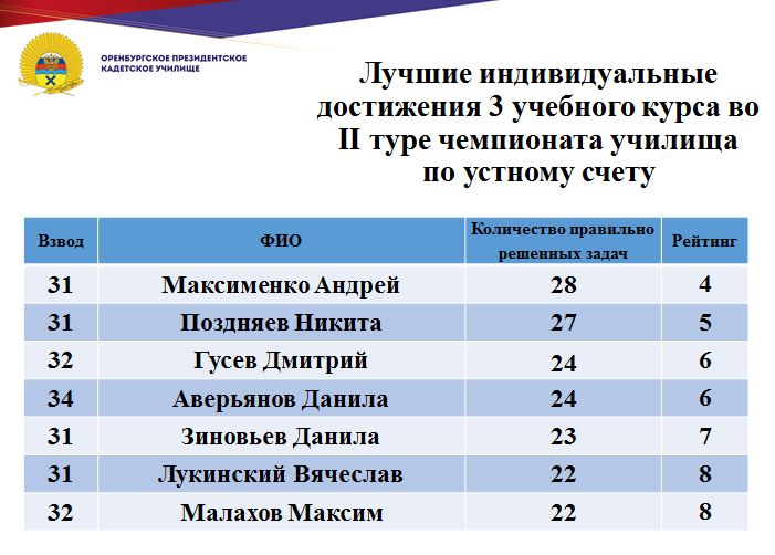 3 место — Каманцев Герман (32 взвод) 29 заданий из 36.
