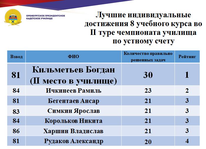 2 место — Кильметьев Богдан (81 взвод) и Коркин Михаил (34 взвод) 30 заданий из 36.