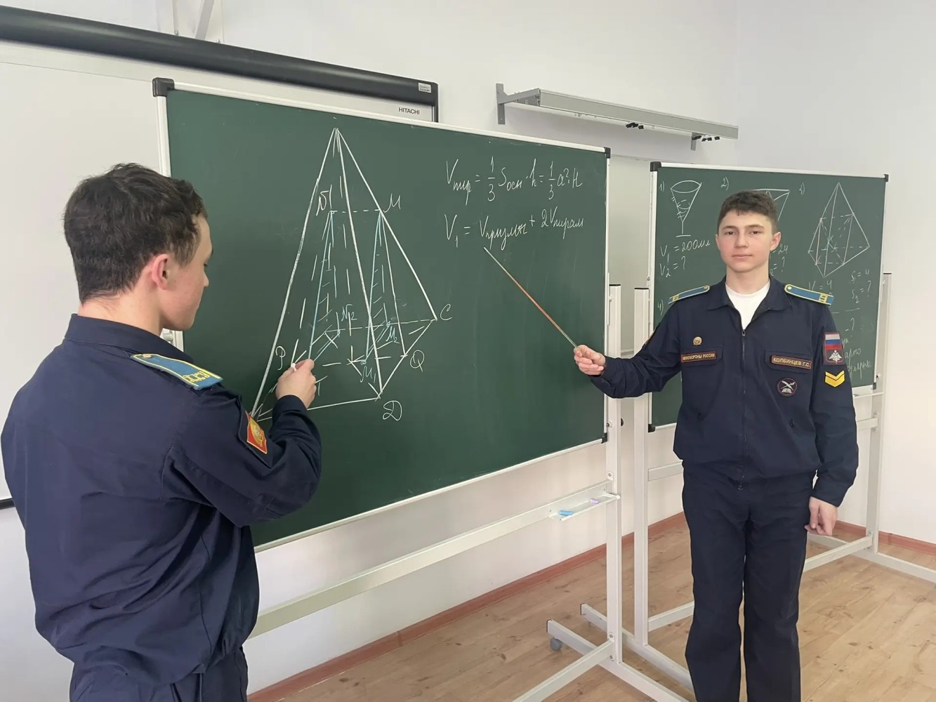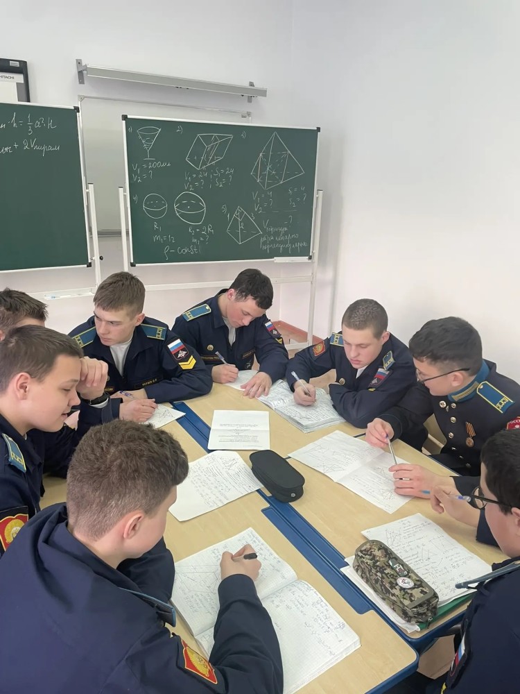 Занятие началось с устной разминки, разбирались практические задачи с геометрическим содержанием. Кадеты приняли активное участие, много спорили, аргументировали свои ответы. Особенно им понравилась задача с заполнением рожка мороженного наполовину высоты, ответ оказался неожиданным. Были также разобраны задачи на пирамиды, в которых длинное решение, но… в первой части экзамена иногда нужно просто запомнить готовый результат.